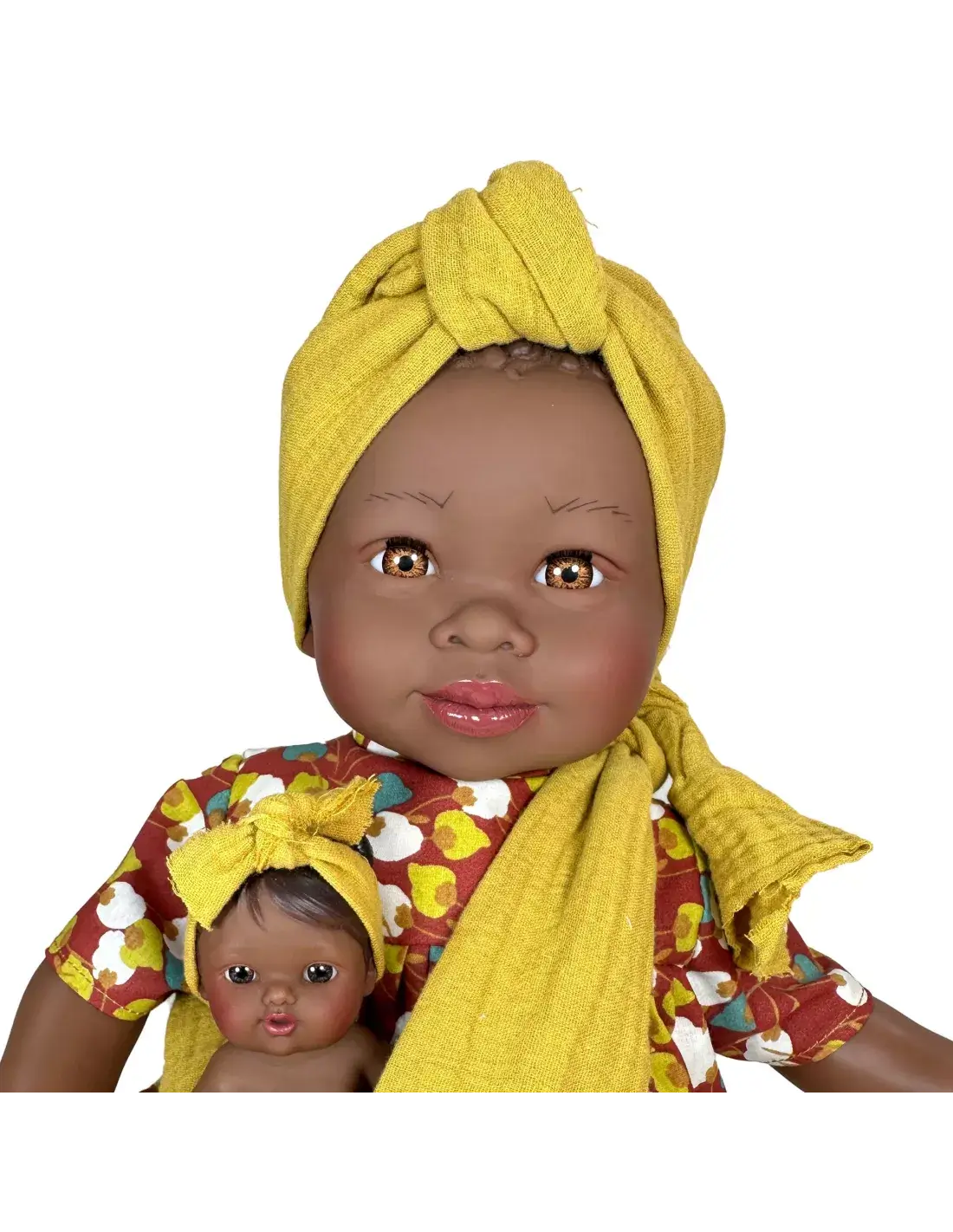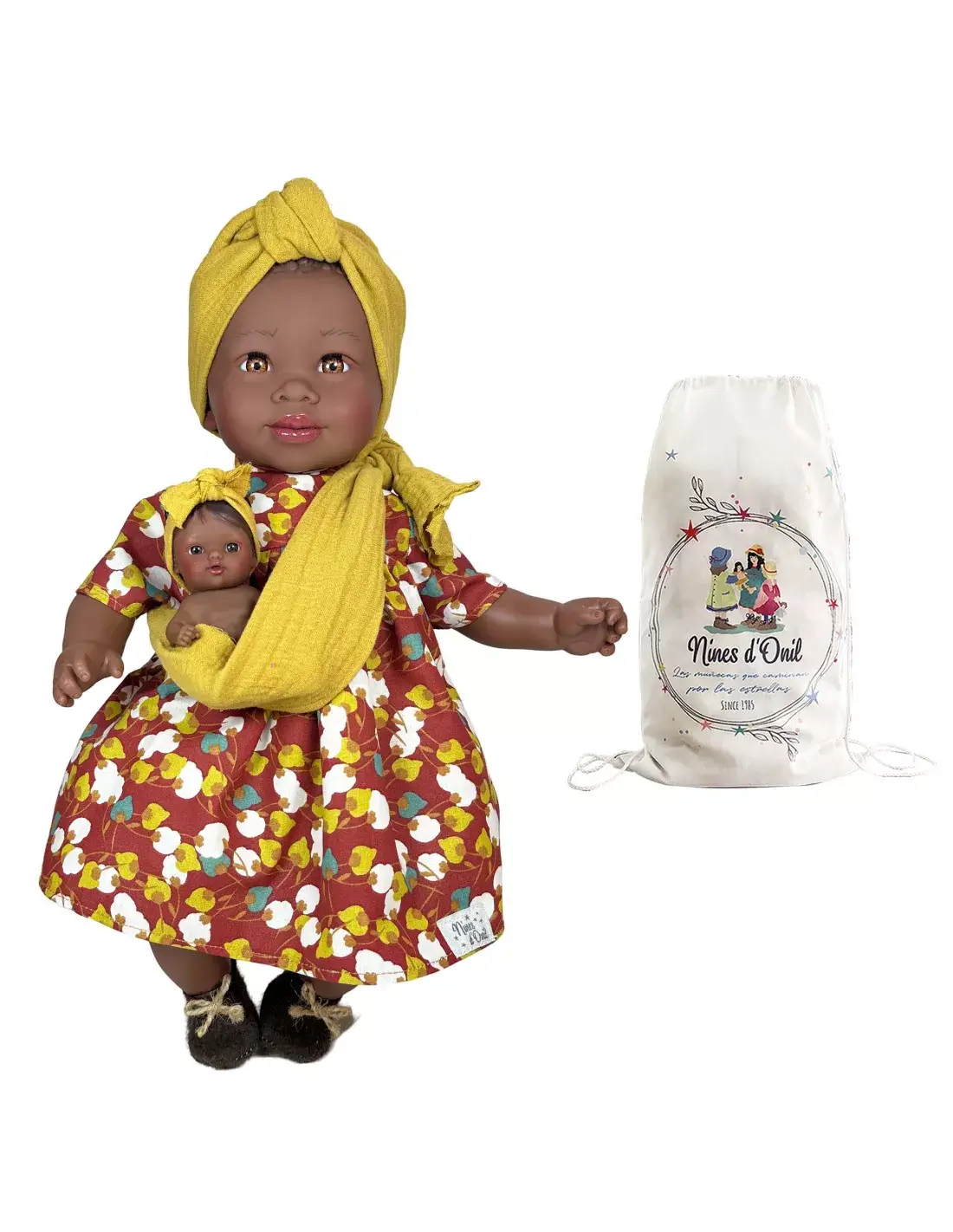 Κούκλα Αφρικάνα Maria με κίτρινο μάρσιππο και μωρό! (45cm).