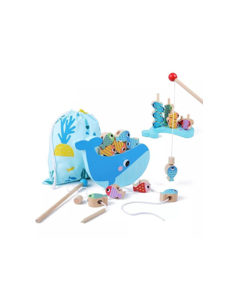 Εσύ πόσα ψάρια μπορείς να πιάσεις; Το παιχνίδι ψαρέματος πολλαπλών δραστηριοτήτων είναι ένα εκπαιδευτικό παιχνίδι, κατάλληλο για παιδιά άνω των 3 ετών. Το παιχνίδι αποτελείται από τη ξύλινη φάλαινα, δυο μαγνητικά καλάμια ψαρέματος, ένα ξύλινο ταμπλό και τα χρωματιστά ξύλινα ψαράκια. Σκοπός του παιχνιδιού είναι το παιδί να ψαρέψει όλα τα ξύλινα ψαράκια με το μαγνητικό καλάμι και να τα ισορροπήσει πάνω στη ξύλινη φάλαινα. Μέσω του παιχνιδιού ψαρέματος πολλαπλών δραστηριοτήτων το παιδί εξασκεί τις κινητικές του δεξιότητες και τη λογική του, ενώ παράλληλα μαθαίνει τη θεωρία της ισορροπίας και της μετακίνησης αντικειμένων.